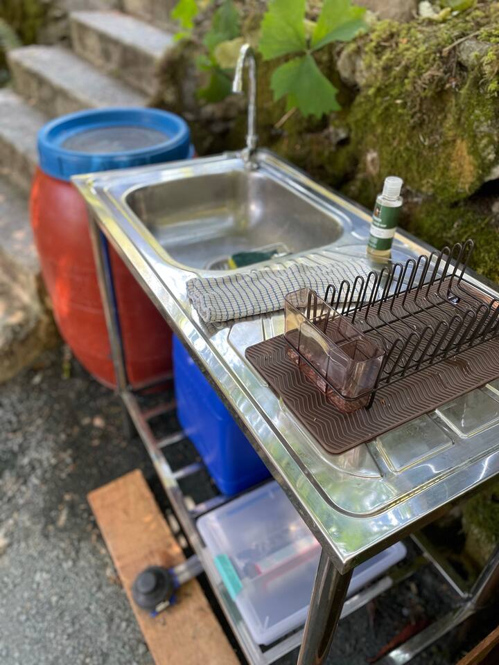 There is a power strip in the dome for convenient phone charging as well as to operate our provided electric kettle - hello, quick hot water for your morning coffee! We also have provided several solar lights, a bug zapper, a cooler and 2 gallons of drinking water w/ disposable cups for your use!