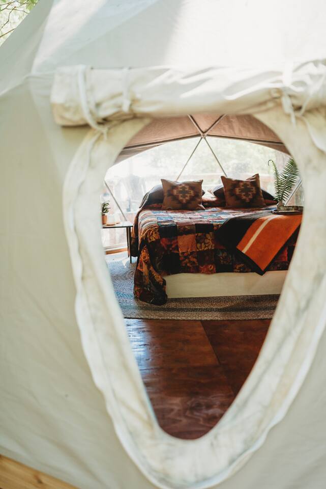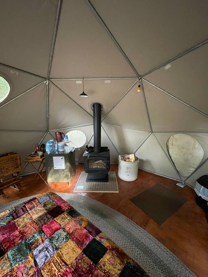 The dome tent is outfitted with a queen size Tempurpedic bed, pillows & high-quality bedding // this space is ideal for 2 guests but we also can provide a sleeping cot for noted additional 3rd guest (recommended for children only). The tent's small wood stove will be available to take the chill off indoors. And a pair of Adirondack chairs to seat you on our back deck for your morning coffee/tea - Complete with our outdoor propane fire-pit for evening ‘smores … what else would one need? There is NO RUNNING water at the dome's site, but there is an outdoor sink with foot-pump operated rain barrel for rinsing your dishes, a brand-new sani-can for a restroom is located on the premises , provided t.p. & hand sanitizer. NO running water also means there isn't a shower. Rural with amenities is exactly what we have ;-) There are showers at our local YMCA and another at our fully remodeled City aquatic center - both are only 5-6 miles from dome.